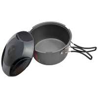 Das zweiteilige Set besteht aus einem Topf mit einklappbarem Griff sowie einem passenden Deckel, der gleichzeitig als Teller genutzt werden kann. Dank der glatten Innenfläche ist der Kochtopf besonders leicht zu reinigen, auch unter Feldbedingungen.